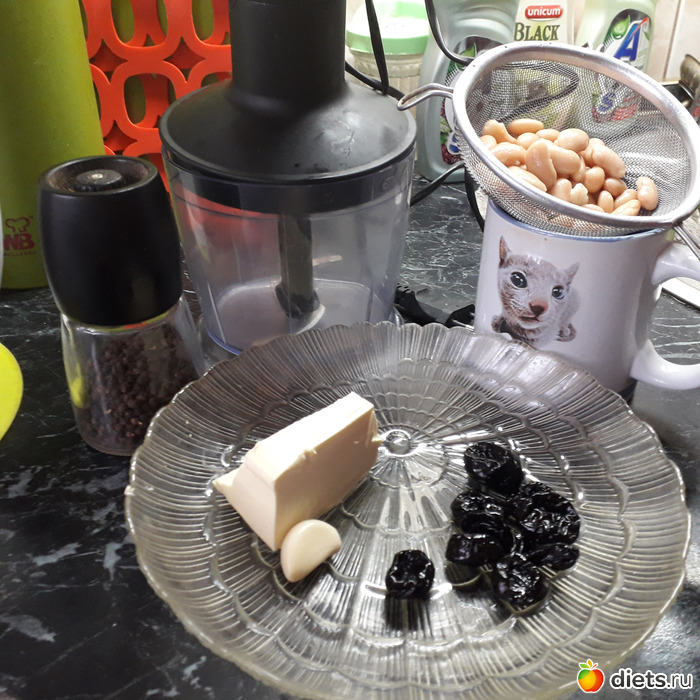 Измельчить фасоль блендером, постепенно добавить фасолевый отвар до нужной консистенции. Добавить туда же чернослив, любимые Вами специи, лимонный сок, размягченное сливочное масло и все хорошо перемешать
