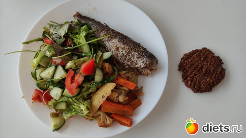 У - запеченные овощи с хеком + салат овощной. Печенька.
