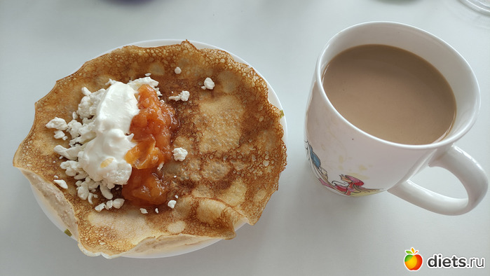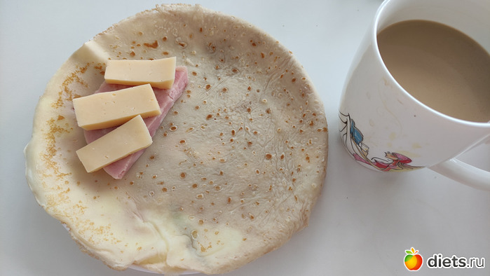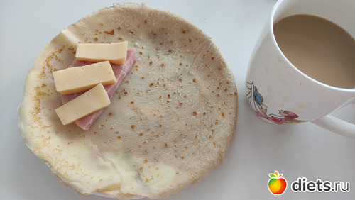 З - блины. Один с творогом, сметаной, яблочным джемом, второй с ветчиной и сыром.