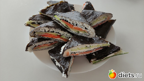 Роллы давно научилась крутить, любые могу не хуже проф сушиста, а такие сэндвичи дела в первый раз, не очень аккуратные вышли, но вкусно и быстро. Начинка моя любимая - творожный сыр, форель, огурец. Можно было и с авокадо, но я не купила...