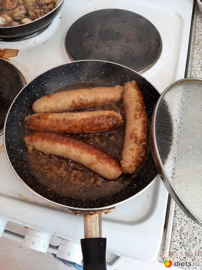 Параллельно с работой пожарила грибочки с луком: вешенки и шампиньоны, а мужу - купаты.