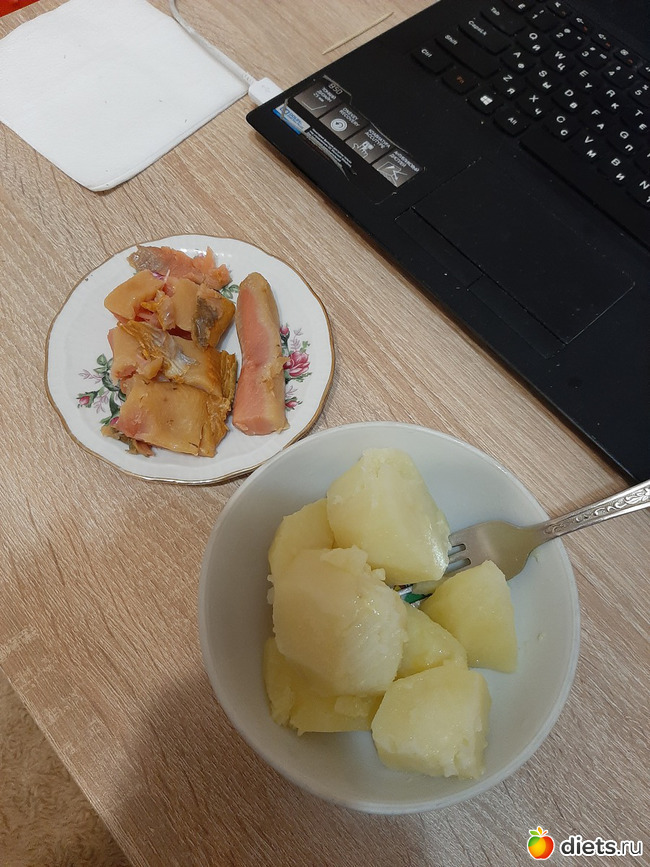 А на ужин был щавелевый супчик (в кадр не вошёл), а супруг попросил сварить картошечки. Сделал с маслом, ну и я чутка с солёной рыбкой заточила - я сегодня из дома работаю, так что можно