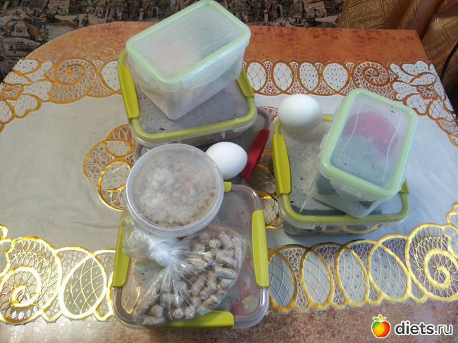 А вот так выглядит мой суточный рацион, рассованный по баночкам и коробочкам.