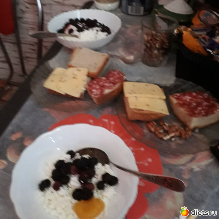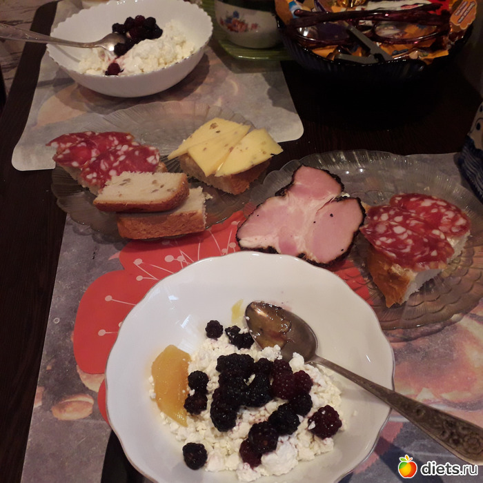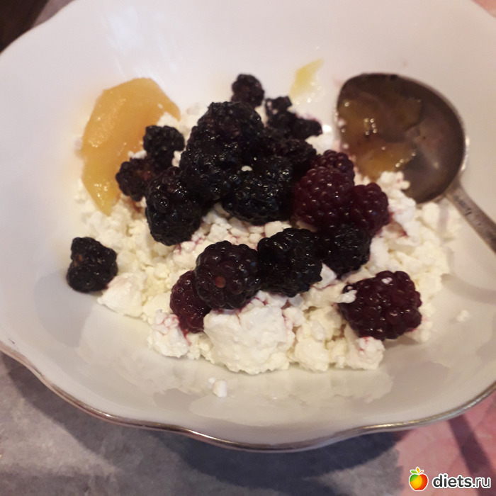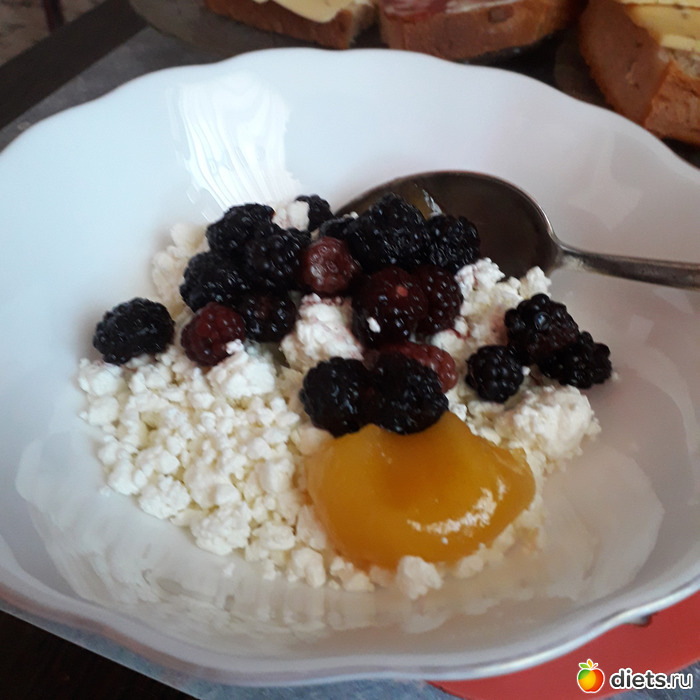 Творог зерненый с ягодами ежевики и с медом, бутерброды, кофе