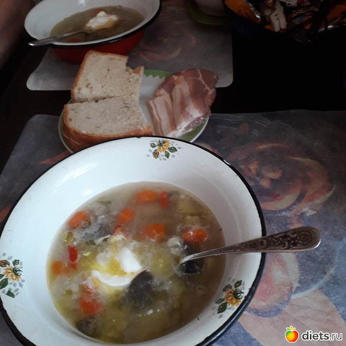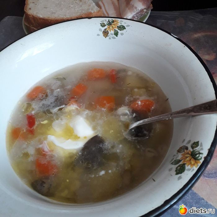 Суп грибной со сметаной, бекон сырокопченый, компот