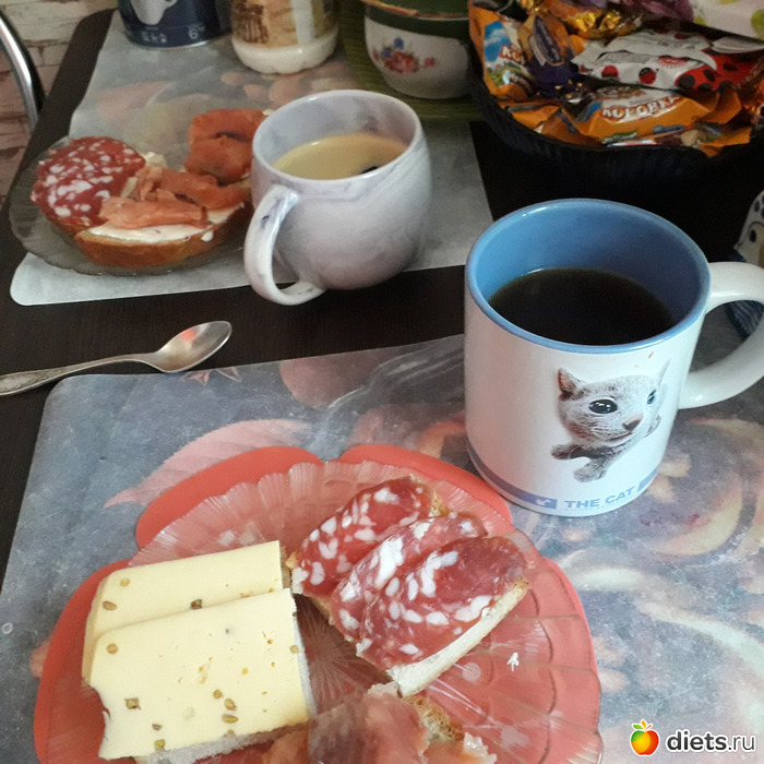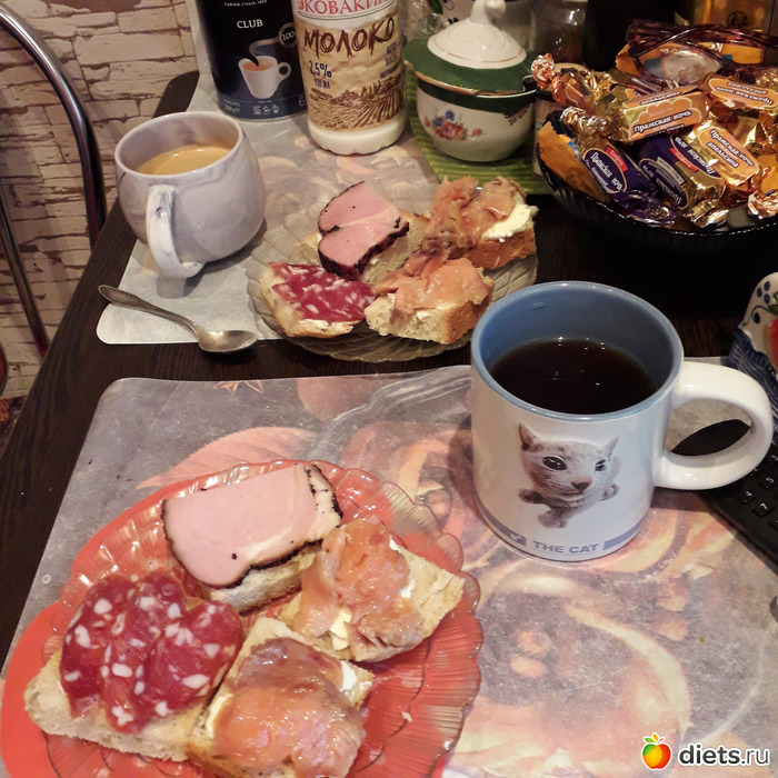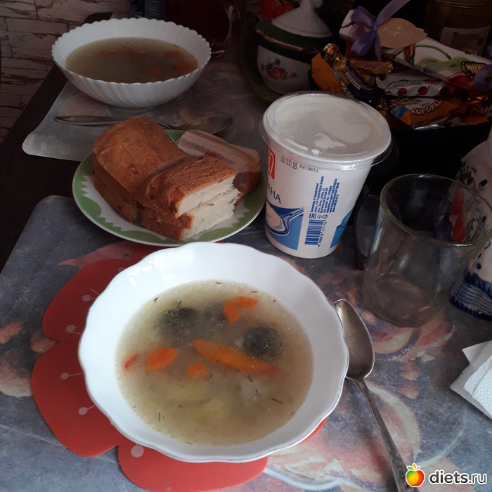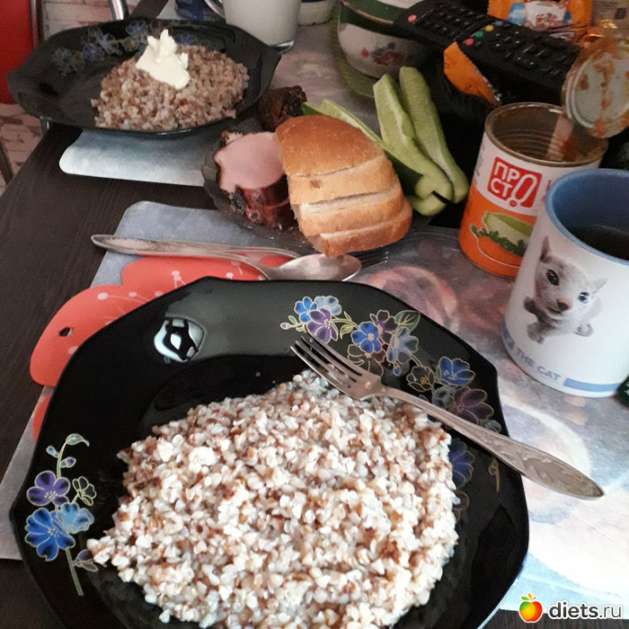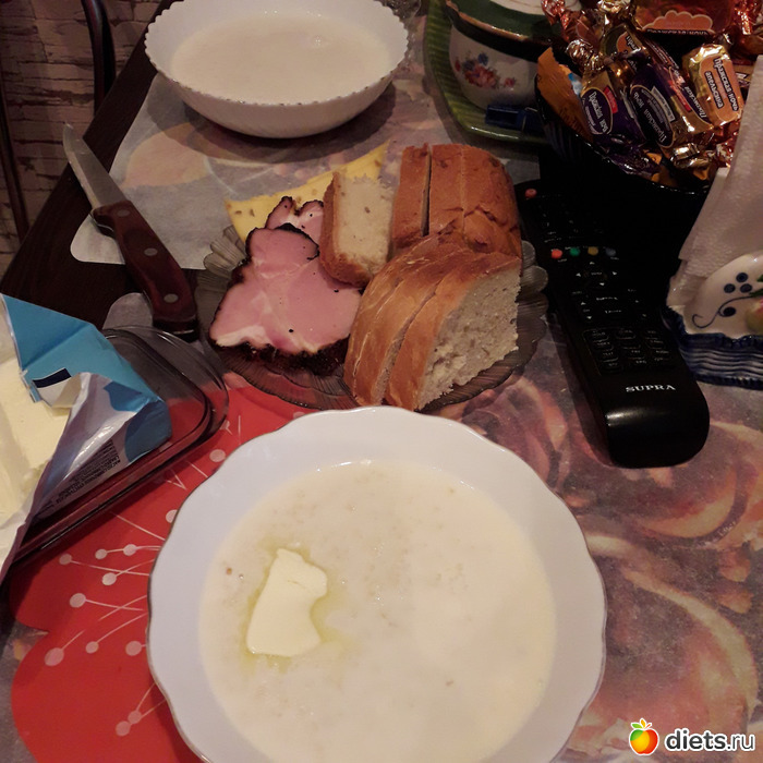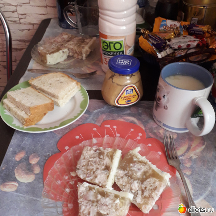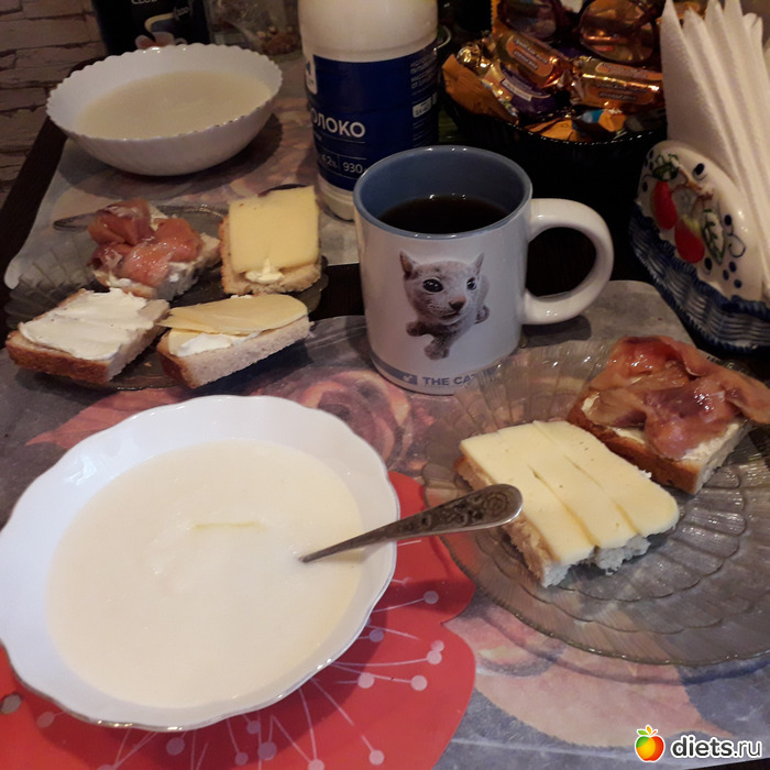 Молочная пшенная каша, мясо, чай зеленый-у мужа ряженка