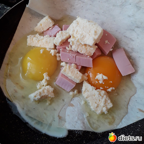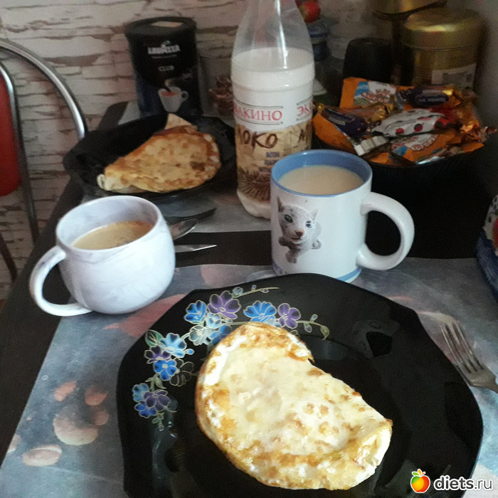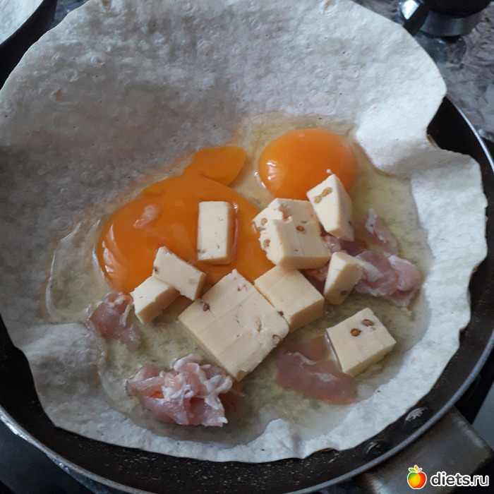 Яичница с сыром и с беконом в лаваше, кофе с молоком
