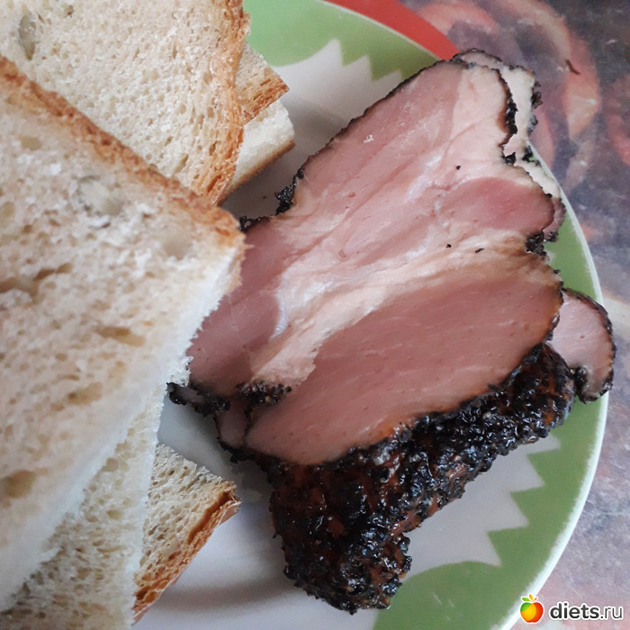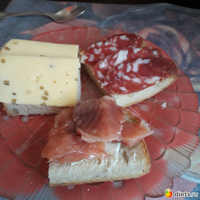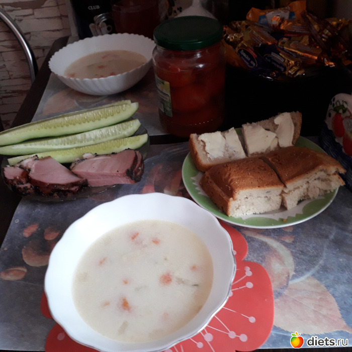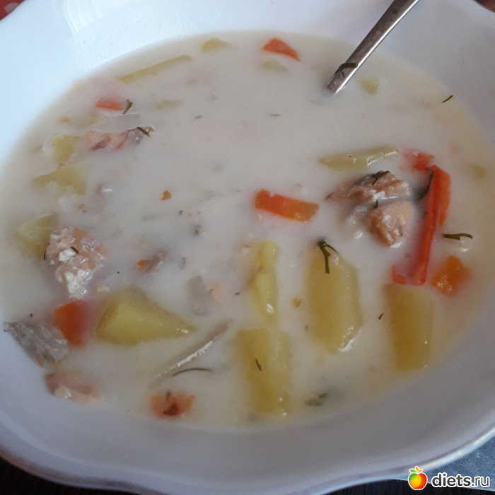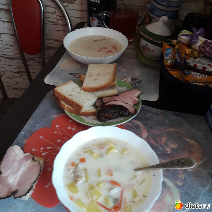 Суп рыбный по-фински, мясо-"Черный кабан"-на бутерброд, компот