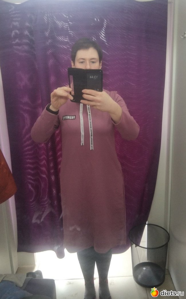 Второе платье в спортивном стиле. Моего размера был только антрацитовый, блекло-горчичный и пыльно-розовый. Взяла розовый, на рекламных фото он казался поярче. Очень удобное мягкое х/б платье. И мне кажется, что оно мне идёт