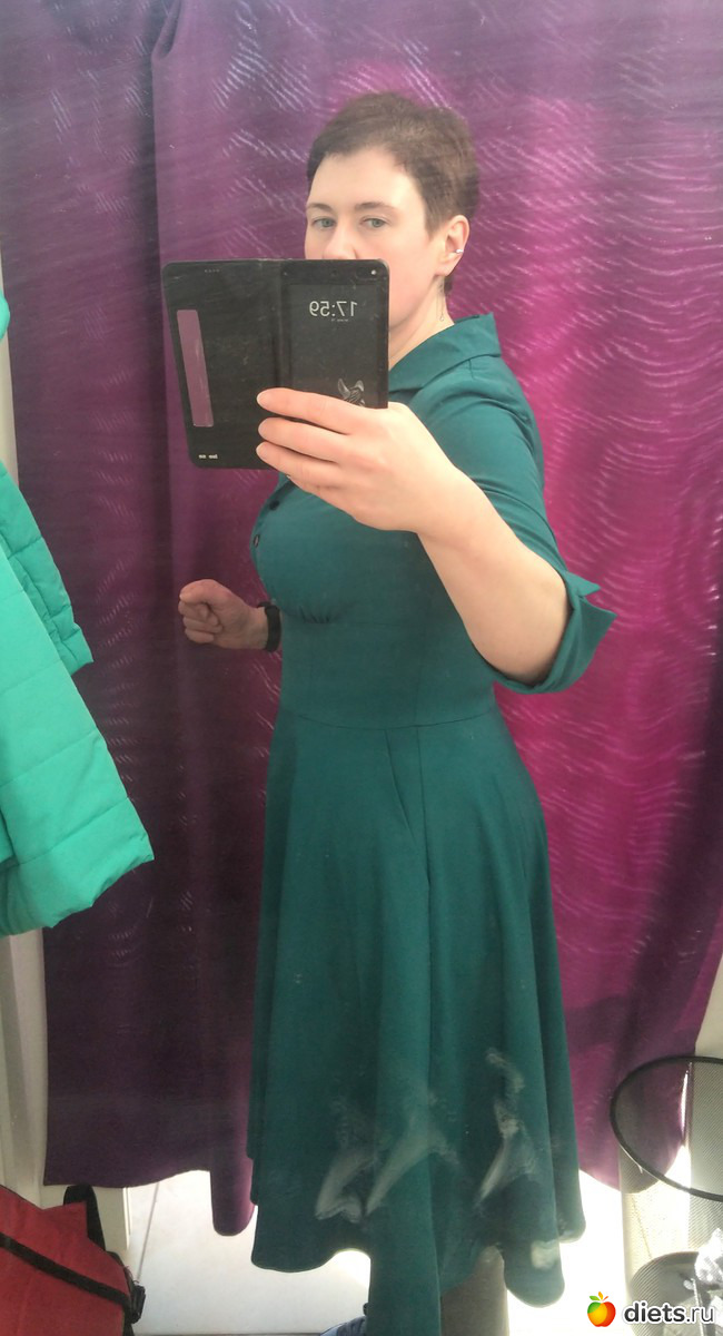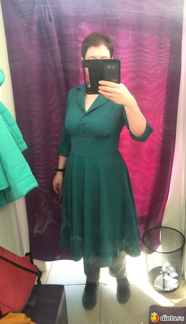 Третье платье. Это был риск. Изумрудный цвет, обязывающий фасон. Но мне кажется, что в отличие от первого платья риск оправдался. Плотновато сидит, но я надеюсь к бабушкиному юбилею через двадцать с небольшим дней скинуть ещё пару килограммчиков и желательно пару сантиметриков. Буду шокировать родственников, которые меня давно не видели