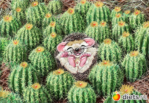 Интересно, а люблю ли я кактус? Тааааак, нужно попробовать! Интересно, с какого начать: вон их сколько на подоконнике стоит - и с цветочками и без! Начну пожалуй, вот с этих, с розовеньких! Говорите, что ёжики цветов не различают? Ну и пусть! Я что виноват, что розовеньким цветом пахнет! Фуууууу!!! Горькие! Ладно, попробую беленькие, тут не ошибёшься в цвете! Нуууу...