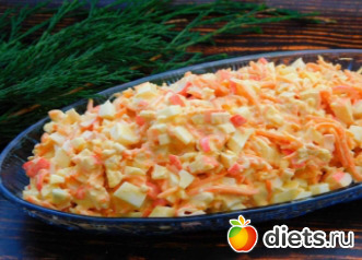Яйца измельчить кубиками, крабовые палочки разрезать сначала вдоль на 2 части, а затем небольшими кусочками. Хорошо охлажденный плавленый сырок натереть на свекольной тёрке.