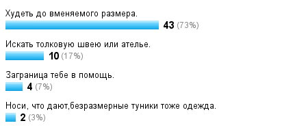 Вот теперь надо или постройнеть до размерного ряда обычных марок, или переходить на индивидуальный пошив, или переходить на безразмерные туники и леопардовые лосины, что продают на рынке размера трихуэль, то ли увеличивать бюджет на шмотки и заказывать одежду из Америки или Европы, где размерный ряд гораздо больше.
