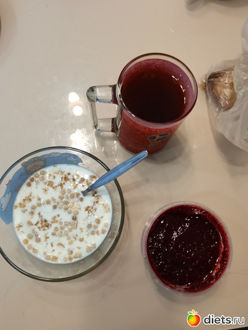 Запеченные мюсли с молоком, чай черный без сахара и немного клюквы, протертой с сахаром. Всего 364 ккал. Завтрак прошел без инцидентов. Лишнего не было съедено. Была гордость за себя.