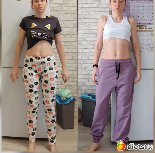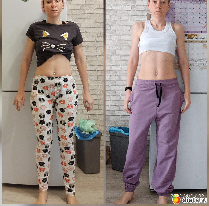Между фото разница в месяц и 2 кг. Активность абсолютно одинаковая - и там, и там регулярные тренировки. Тётя слева не следит за питанием, тётя справа следит