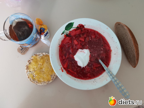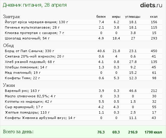 Наела я за день будь здоров... Если бы не шоколад и большая порция борща, можно было бы не выходить за рамки 1500 ккал.