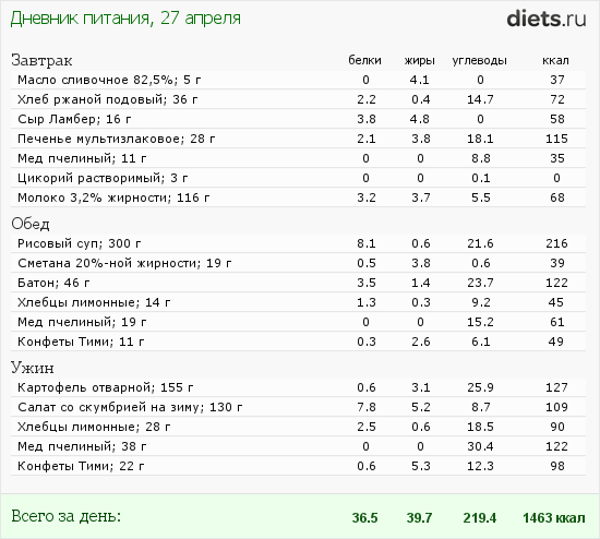 Обнаружила прекрасные возможности этого сайта вести тут дневник питания, не тратя время на подсчеты вручную. Вдобавок всё сводится в аккуратную таблицу. Визуально так удобнее
