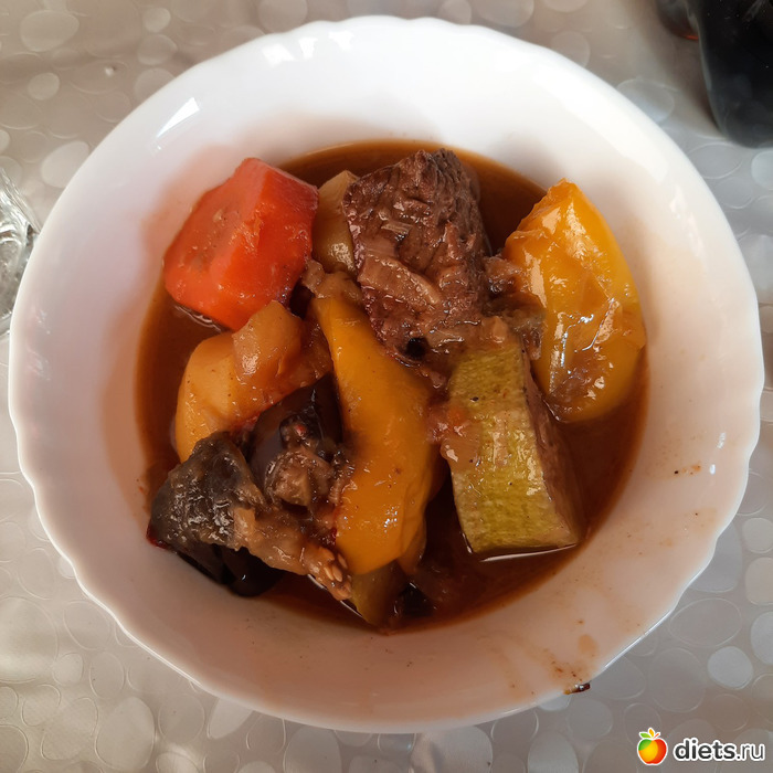брат приготовил на своей печи-камине-барбекбшнице ПП блюдо. его козырное. мясо с овощами в казане
