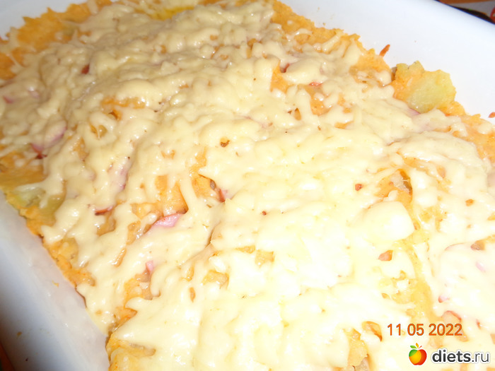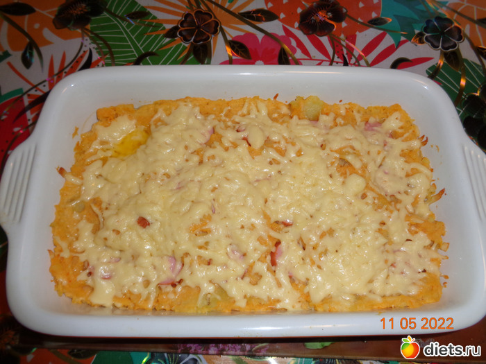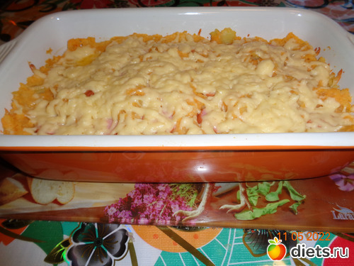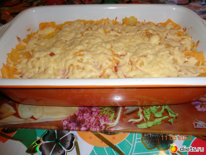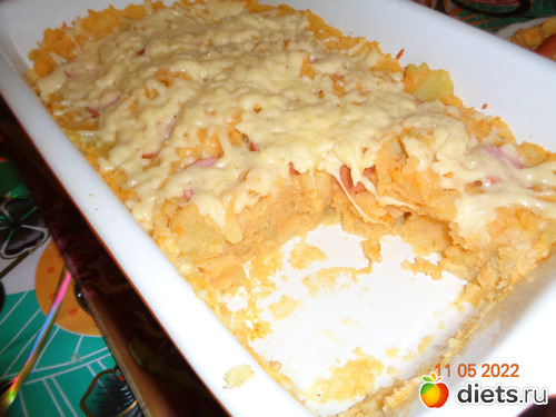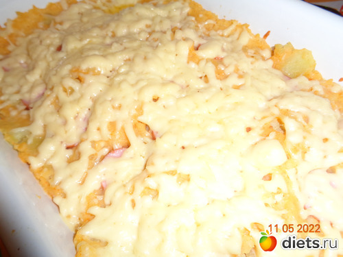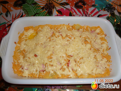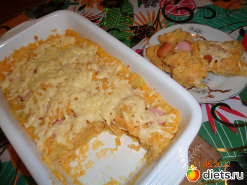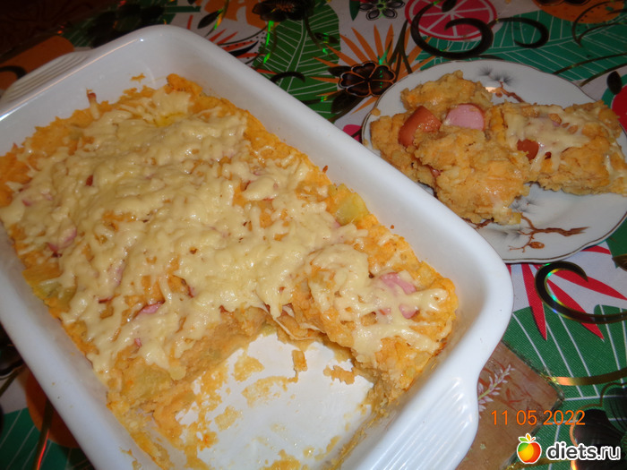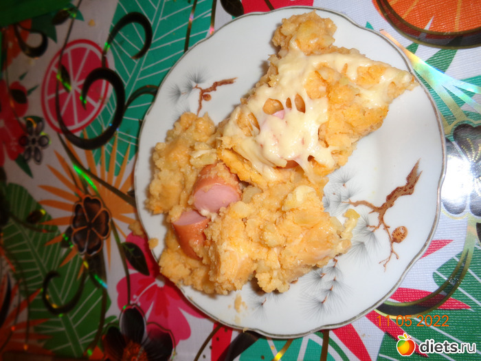 14. Картофельная запеканка с сосисками готова. Подавайте запеканку в горячем виде в качестве основного блюда на обед. Дополнительно предложите салат из свежих овощей или соления.