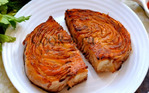 Небольшой кочан капусты разрезаем шириной примерно по 3 сантиметра. Далее каждую «шайбу» режем пополам по кочерыжке. Идеально, когда все листья держаться на ней, тогда они не будут рассыпаться после запекания. Такой размер как раз удобен для деления на порции.