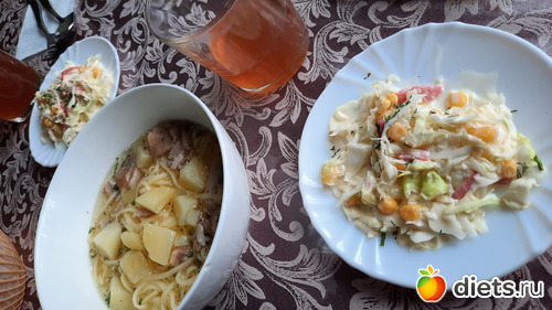 а на обед была лапша+салат+куриные крылышки с макаронами