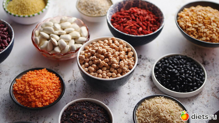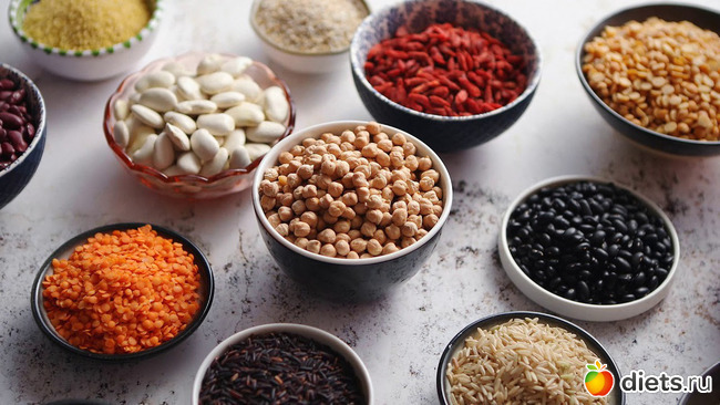 большее количество овощей, фруктов, цельнозерновых продуктов, бобовых, орехов и сои;