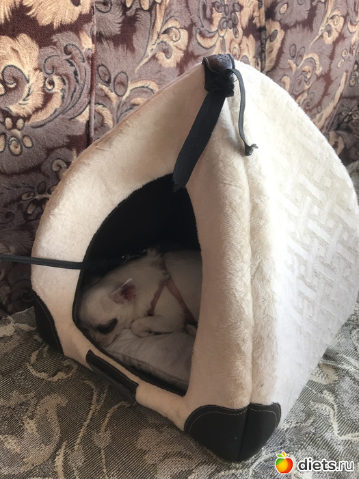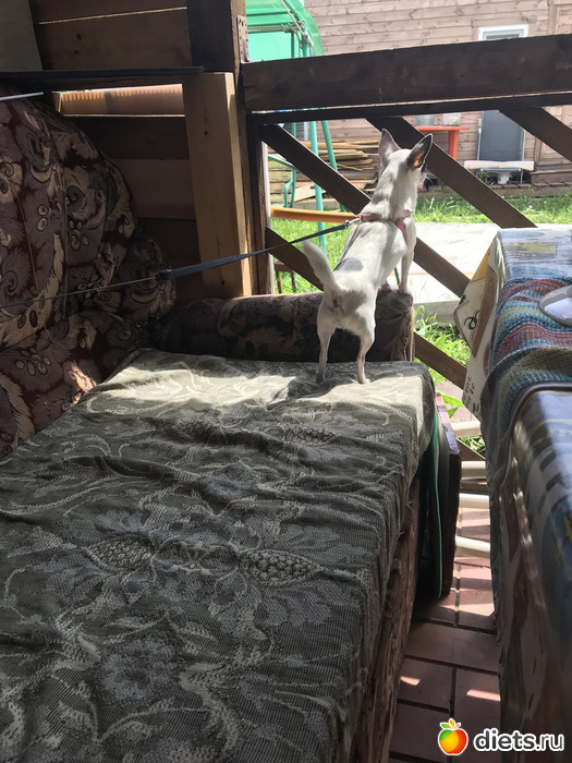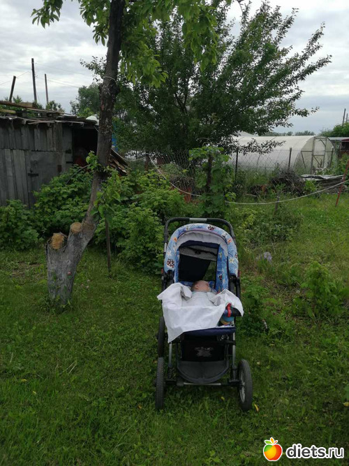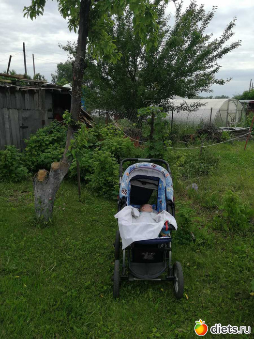 наш главный мотиватор Полина отдыхает под остатками яблони. Спит в своей кроватке ночью и ей очень нравится все!