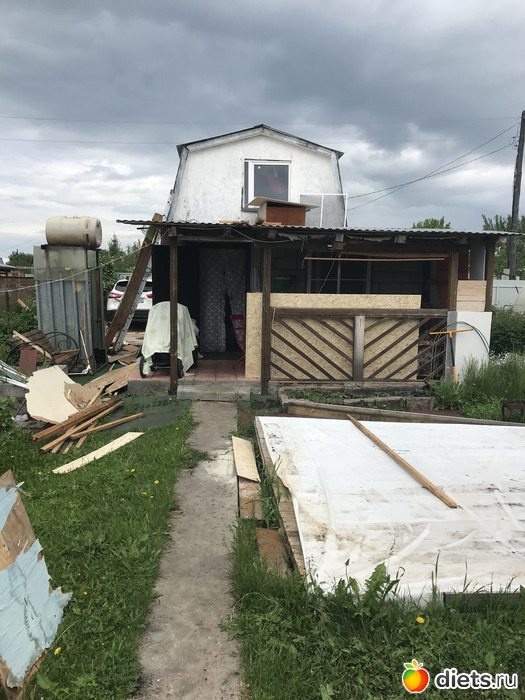 вот так это начиналось. Вид снаружи. Вытащили один диван на крышу веранды, второй пришлось оставить внутри, он очень большой. Просто накрыли его пленкой. Внутри даже не снимала. Вскрывали потолок и старую обшивку около окон. Мусора было! Я была в ужасе! Но ничего, глаза боятся, руки делают.