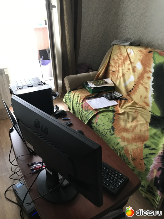 На работе новости хорошие. Нас не выводят в офис! Пришлось организовать себе постоянный кабинет, а то офис в зале уже напрягать стал. Купили журнальный столик и теперь мое рабочее место выглядит вот так.