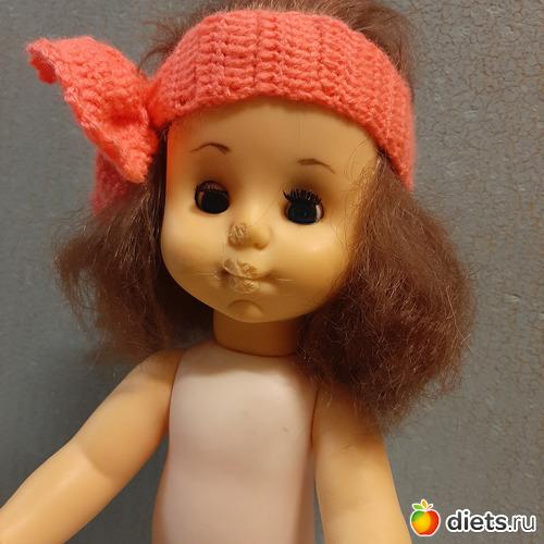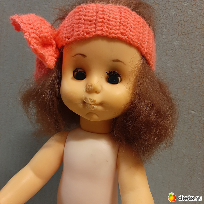 Нет части носика, губок, рот разорван, большой пальчик откушен. Ну и чумазая, вся в опилках и стружках, пыли и грязи.