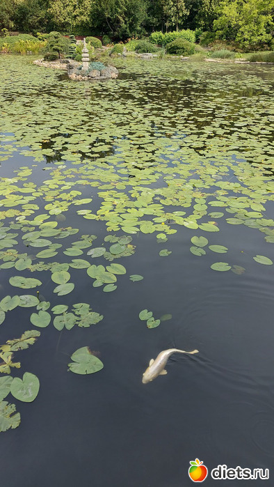 Карпы такие жирные, прям сантиметров по 70, и самых разных цветов, пестрые, полосатые, темные, светлые, красные