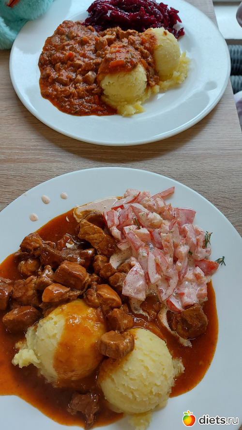 Мне - гуляш из свинины, пюре, салат из помидоров.