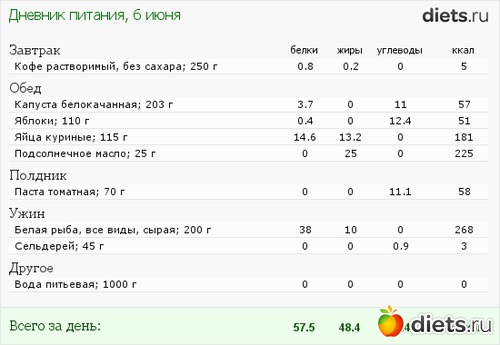 Из капусты и половинки зеленого яблока сделала салат, заправила его смесью льняного и подсолнечного масла и вареные яйца, салата по объему получилось много разделила на 2 раза, встаю я рано, а ложусь поздно поэтому и прием пищи не 3 раза в день, а 4 иногда 5(но по немногу). Томатную пасту развела 300 мл. воды и выпила вместо томатного сока.
