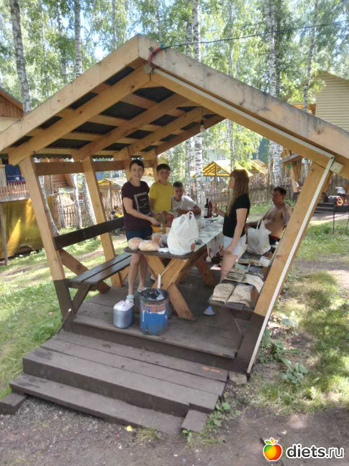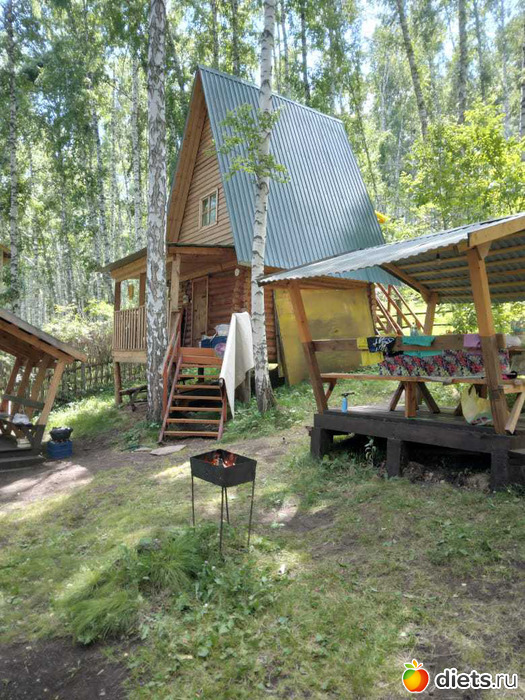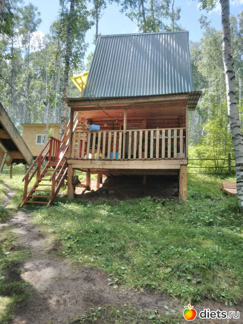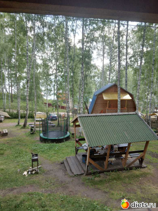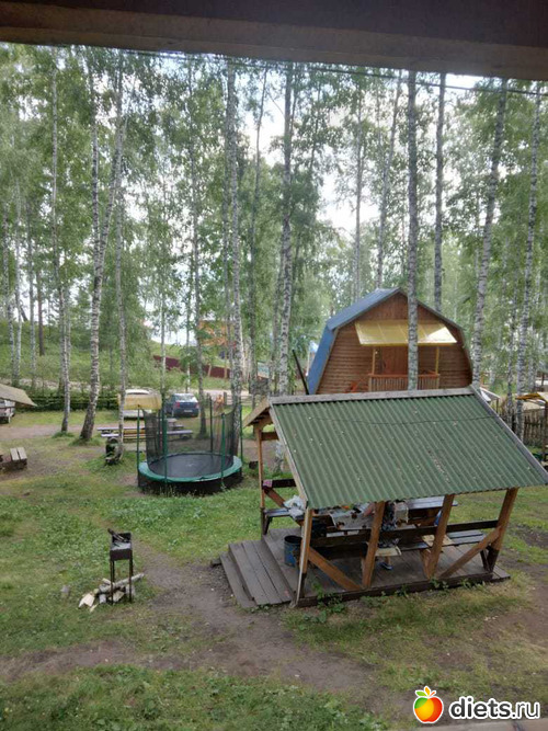 жили в таком домике. Вокруг березы высоченные, никаких кровососущих, горки везде, ноги качаются офигенно. Туалеты деревенские, есть бани, душ, вода только холодная. Кухня общая. А в домиках холодильники, чайники, СВЧ. Беседки, рядом мангал. Ляпота!!!