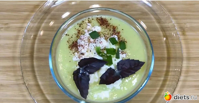 Супчик получается шикарного цвета. Ну а вкус описывать нет смысла. Лучше просто его приготовить и попробовать самим. Я сервирую такой Гаспачо кусочками брынзы. Она великолепно сочетается с нежным вкусом кабачков. И еще обязательно использую базилик, который придаёт супу более насыщенный и яркий аромат. Чем больше листочков положить в тарелку, тем ярче получится не только аромат, но и вкус. Не лишним считаю и немного зелёного лука. Но это для особых любителей остринки.