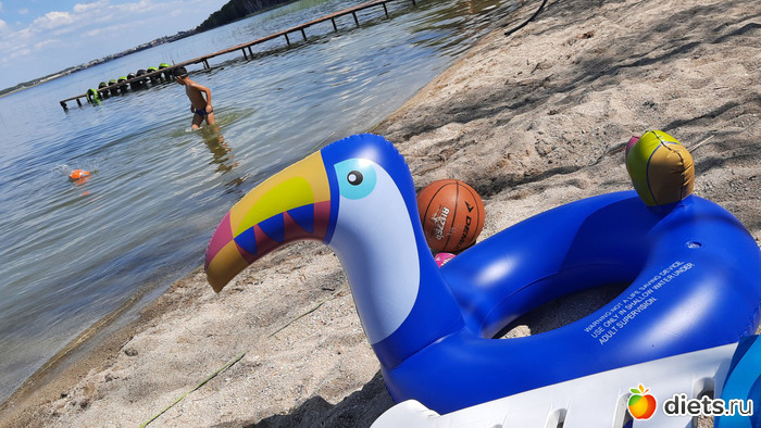 накупались, нанырялись, Ляля училась плавать. В бассейне глубоко, но она вообще не боялась, бездумно на глубину сама не лезла, всё по бортикам, старалась делать плавательные рывки на глубину, но быстро возвращалась или к нам или к бортикам. и визжала от счастья. деда, кроме кругов, купил ещё ей такие штучки на пояс, которые держат на плаву. мы всем по очереди пользовались. то штучками, то кругами, то красивым гордым туканом))))