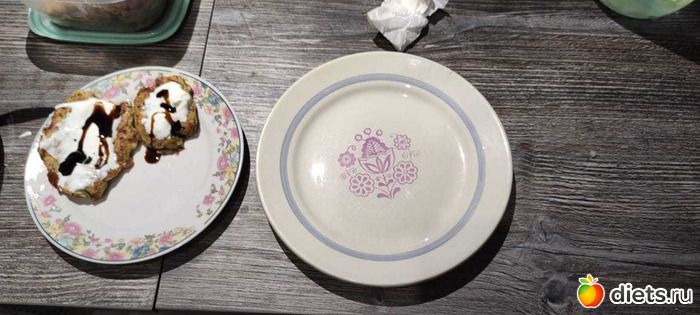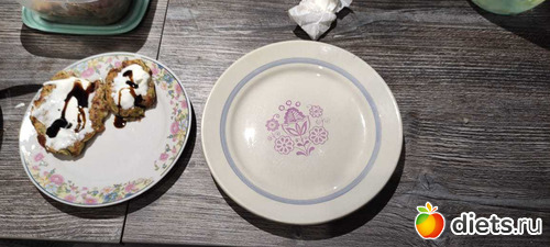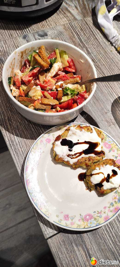 Ужин: овощной салат + кабачковые оладья со сметаной и бальзамическим соусом)