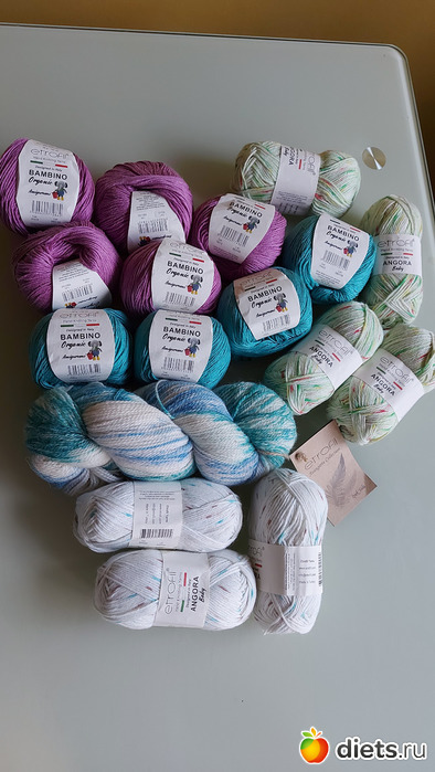 Сиреневые, голубые и верхние пестренькие дочка выбрала себе на свитерки, нижнее - малышу