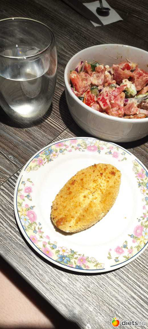 После просмотра шоу я готовила ужин себе и парню) У меня был овощной салат: помидор, огурцы, красный лук, сиртаки, сухарики, немного масла + песто, котлета из лосося(такая гадость оказалась), ее жарила на сковороде без масла.