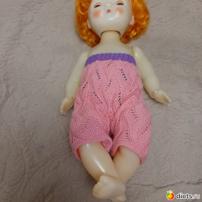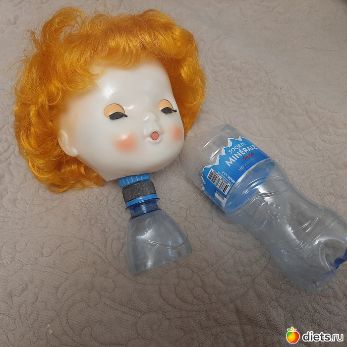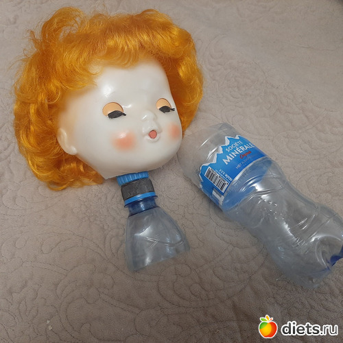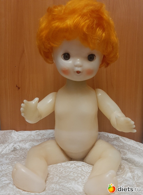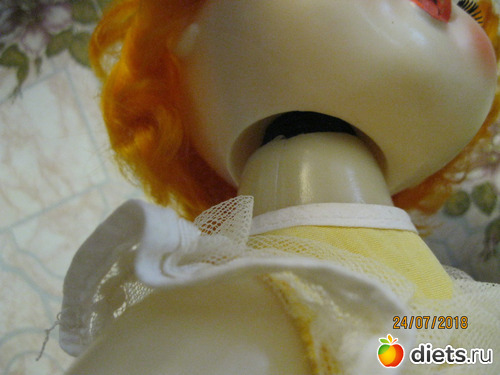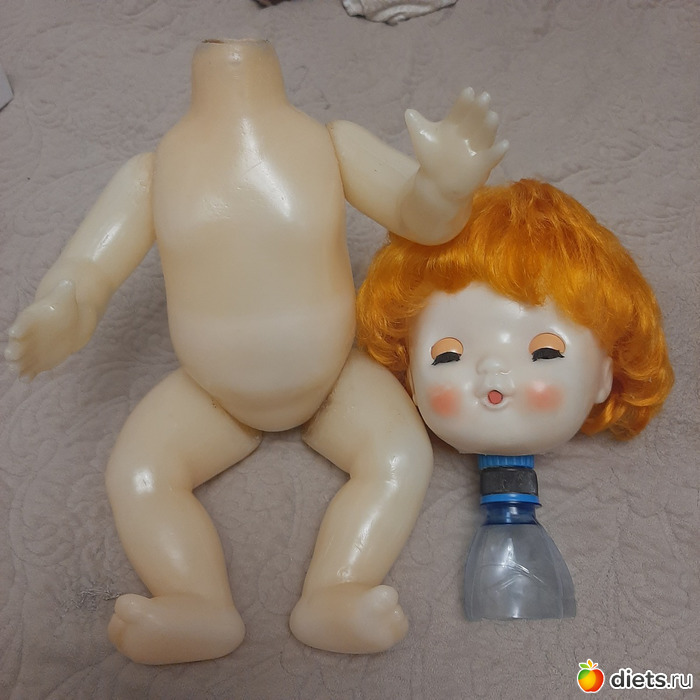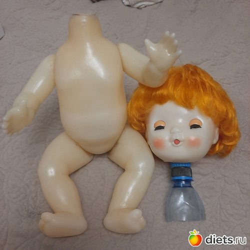 Алёнка должна отказываться от *ложечки с кашей*и активно *сосать бутылочку с молочком*. Ни ложечки ни бутылочки не было. Но это - ерунда. Руки-ноги с проблемами. У нее была отделена голова от туловища. Мы с мужем попробовали посадить ее на резиновую муфту, черную. Но это было неудобно для куклы.