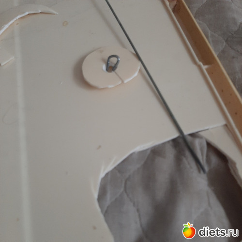 Руки-ноги решила посадить на резинку. Но для этого нужны петли в руках-ногах. Помог муж: вырезал из пластика подобие кружочков, просверлил по центру отверстие и вставил жесткую проволоку, изогнутую петлей.