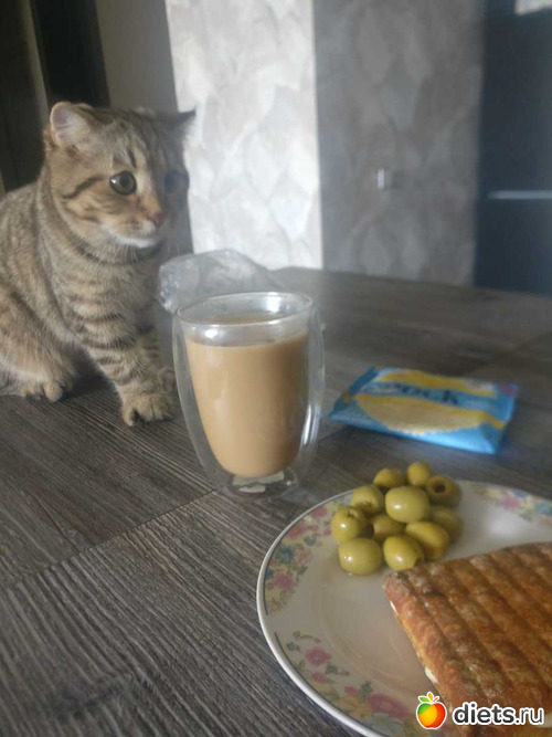 Завтрак: сэндвич как всегда, оливки + печенье без сахара манго и рис, кофе с молоком