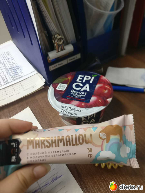Сегодня у меня на завтрак йогурт эпика с вишней и батончик с зефиром с карамелью в молочном шоколаде, но мне не зашел он... и конечно же кофе со сливками