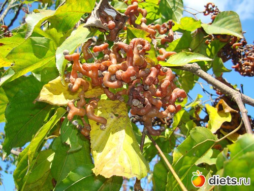 Именно она, разрастаясь, когда никчемный плод созревает, становится сладкой и мясистой. Уже созревая, она содержит больше 25% сахара, а подвяливание делает ее совсем сладкой – плодоножка тогда содержит до 48% сахара. Вкус «конфеток» восхитителен – нежный, кисло-сладкий. Он, говорят, напоминает изюм отдаленно. Плоды говении можно есть прямо с дерева, можно хранить, можно добавлять в любые десерты.