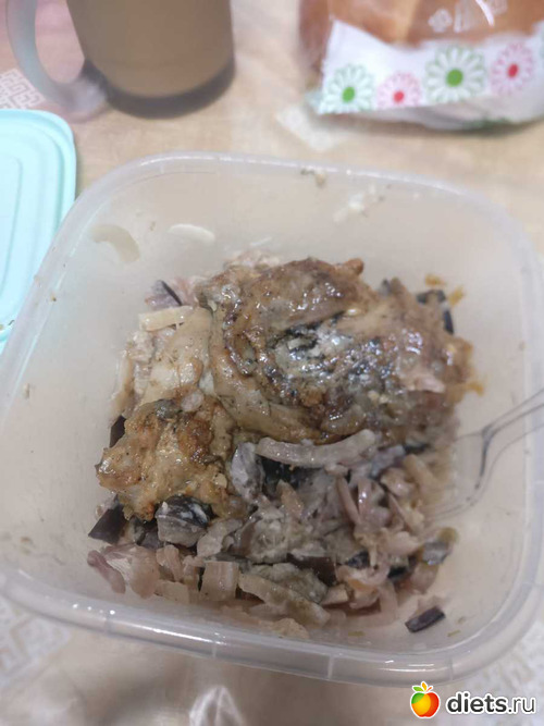 Обед: салат с баклажанами (съела не вес, не захотела и просто выкинула) + тушенный кролик