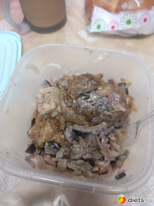 Обед: салат с баклажанами (съела не вес, не захотела и просто выкинула) + тушенный кролик