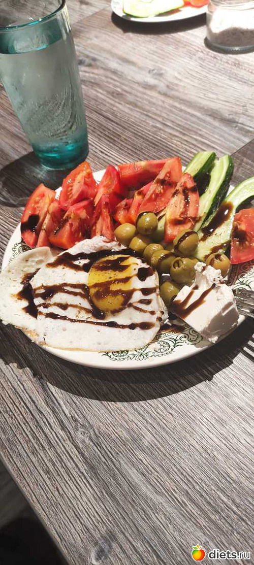 Ужин: два яйца жаренных, овощи + оливки + сиртаки