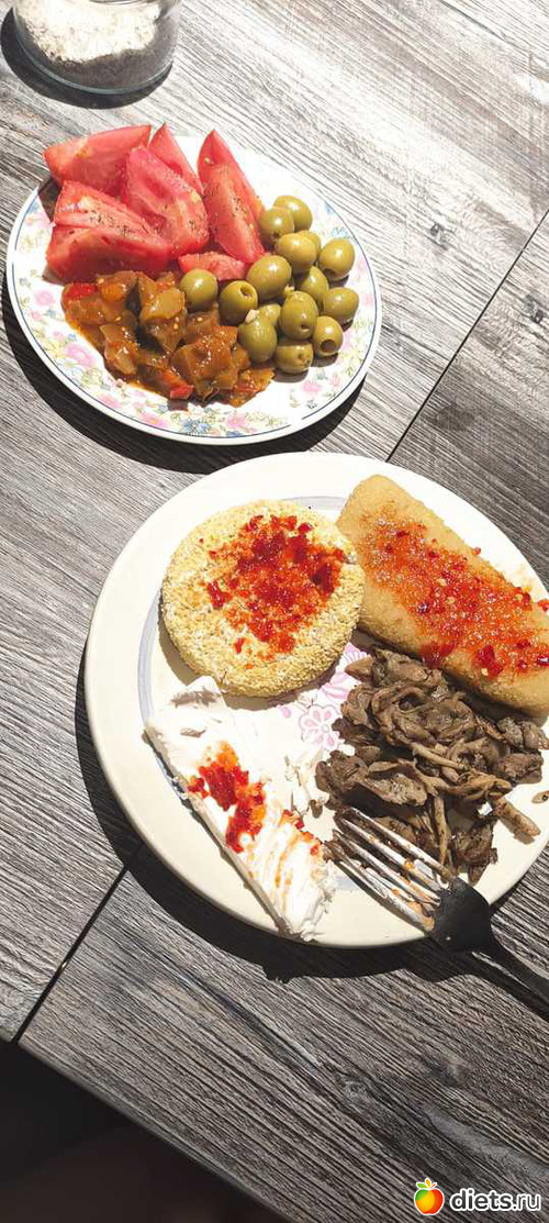 Ужин: котлета из трески + котлета из кальмара + помидоры + оливки + баклажаны с овощами + острый соус (его не смогла посчитать, так как не нашла его в приложении. Его тетя делает сама это типо сладкий чили)