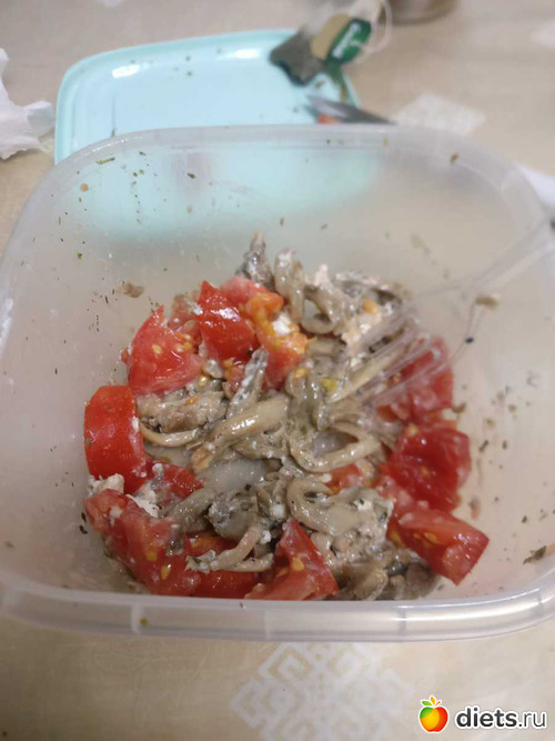 Обед: вешенки + сиртаки + помидоры. Обед такой маленький потому что в четверг я не захотела ничего готовить