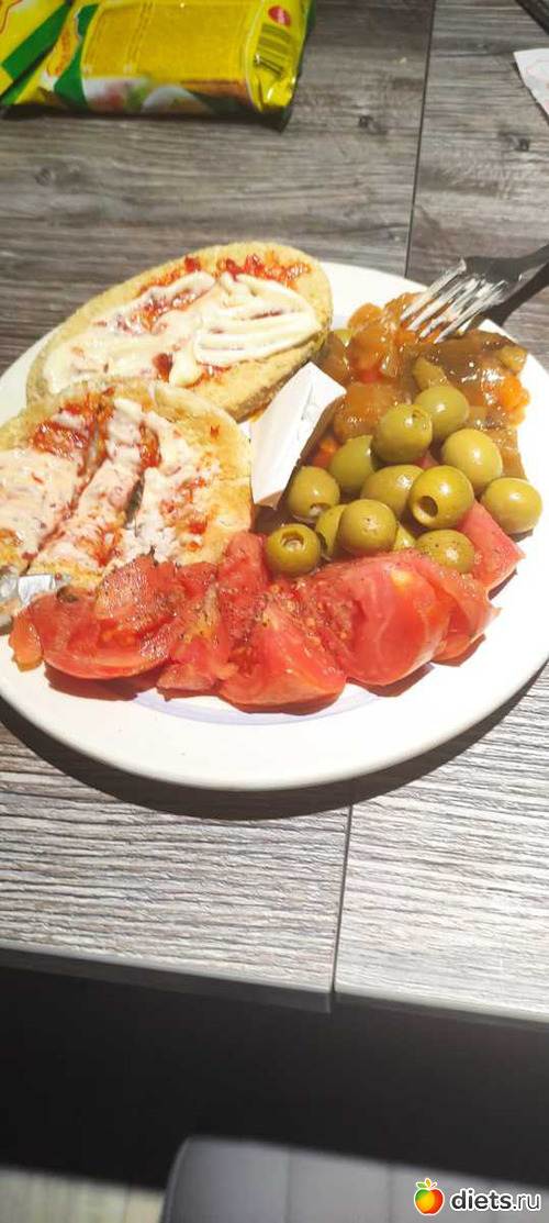 Ужин: яичница из 1 яйца + 4 соленых огурца + помидор + сиртаки + оливки